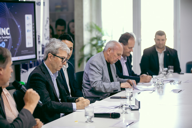 La presentación continuó con la firma del convenio específico de cooperación académica y vinculación tecnológica, que establece la creación formal de la OVT y su Plan de Acciones. La sede operativa funcionará en Campus Norte UNC, que aportará infraestructura y servicios, mientras que CEICYT y APIA integrarán la estructura de gobernanza.