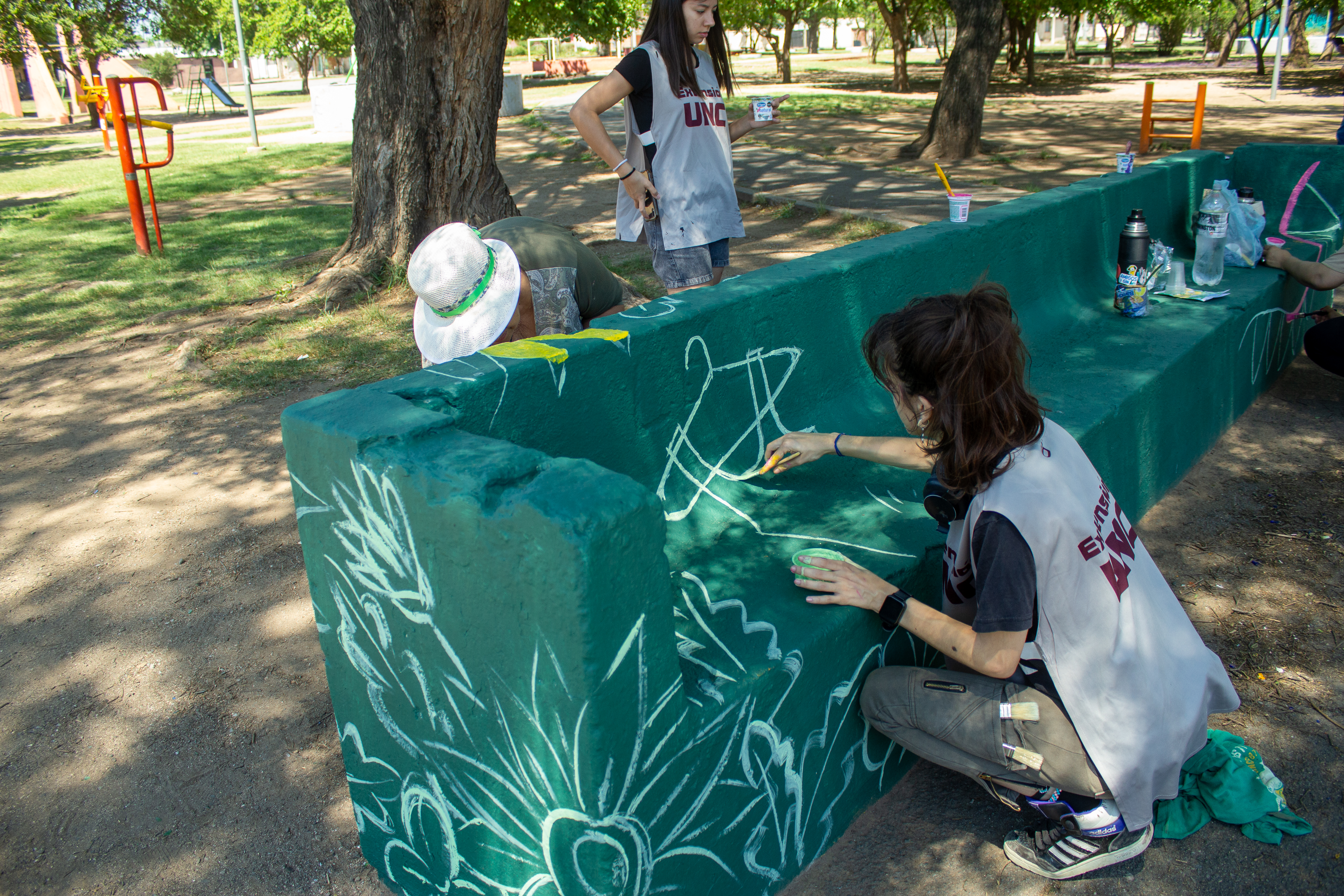 El proceso a través de los encuentros tuvo como objetivo, además de conocer aquellos hitos a destacar del barrio, conversar con estas mujeres acerca de su rol como mujeres trabajadoras, quienes además de sus tareas y obligaciones diarias, llevan adelante emprendimientos de diversas características. A través de talleres en la Asociación Civil y visitas a la feria en donde conocimos a más vecinos y vecinas, enfocamos el trabajo en el espacio de la plaza ocupado para la feria, y decidimos realizar una intervención mediante la pintura de girasoles y elementos que representan a las mujeres participantes. La idea era crear un mural que atravesara las estructuras, generando además, una identificación con el espacio que es central en el barrio y funciona como el punto de encuentro para quienes lo habitan.