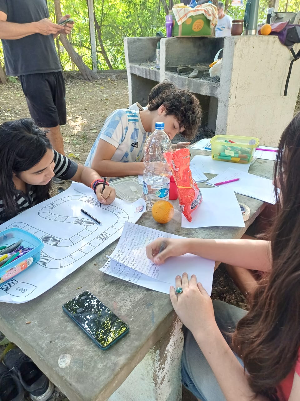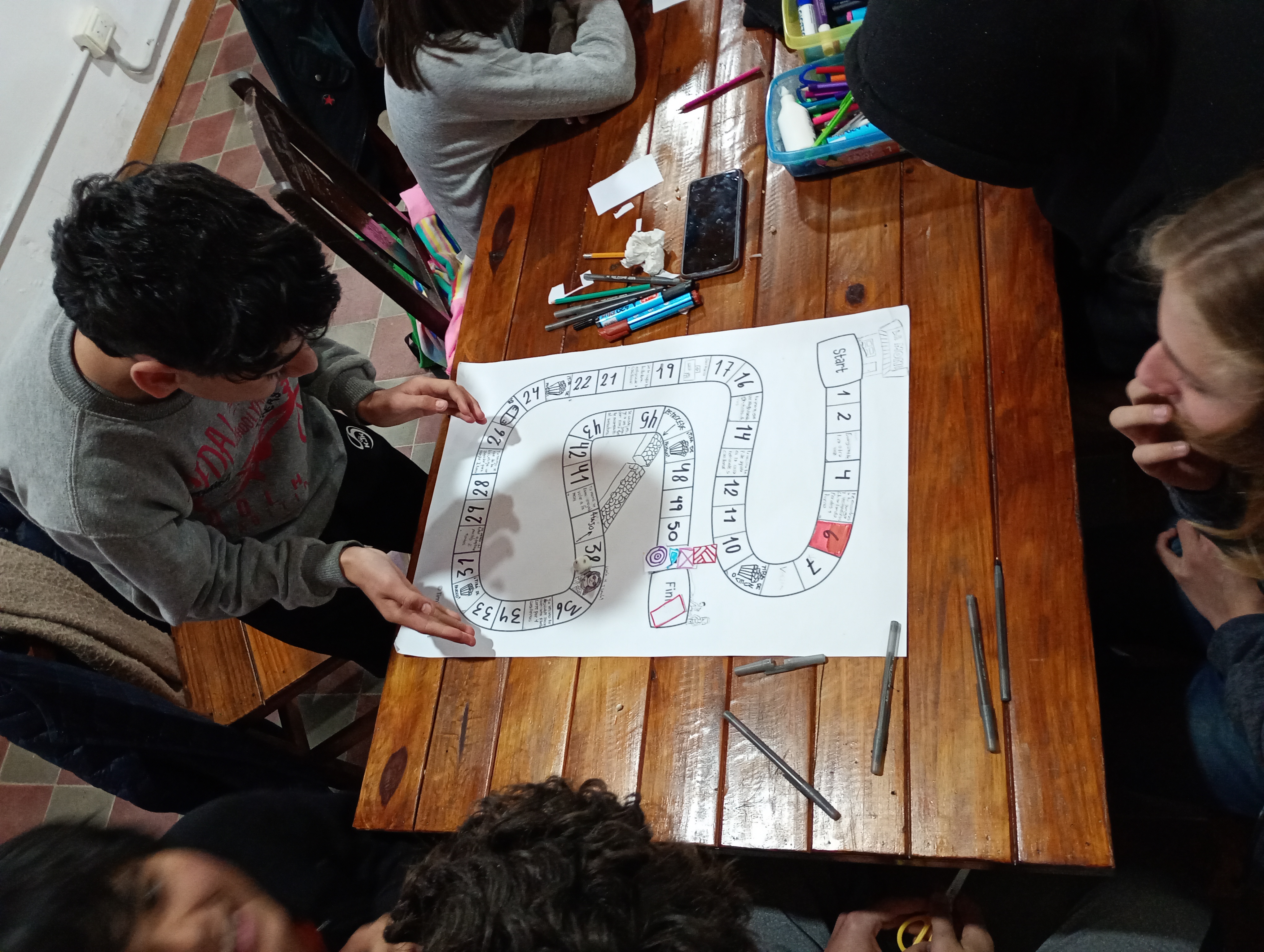 El sexto encuentro se realizó el sábado 30/8. Allí, quienes los/as jóvenes que participaron se dividieron en dos grupos, y cada uno armó su propio juego de recorrido. La consigna para hacerlo fue que el recorrido tenía que transcurrir en Los Aromos en un día de mucho calor en el que un grupo de jóvenes quería ir al río como meta. A partir de esa premisa cada grupo ideó su propio itinerario, el punto de salida, las situaciones intermedias que se presentaban y cómo eso se expresaba en el juego (adelantando lugares, perdiendo un turno, volviendo a empezar, etc.).